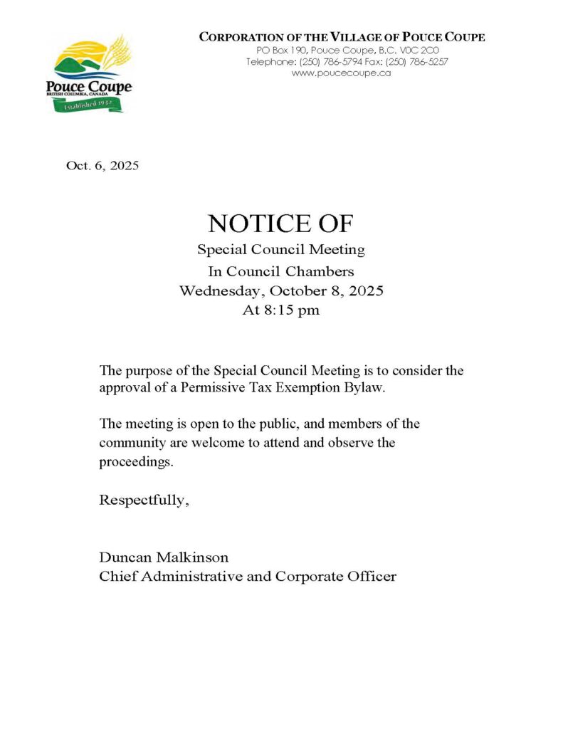 Notice – Special Council Meeting – October 8th, 2025 October 6, 2025 ← Notice of Public Hearing on Official Community Plan – October 22, 2025Have a Safe and Happy Thanksgiving →