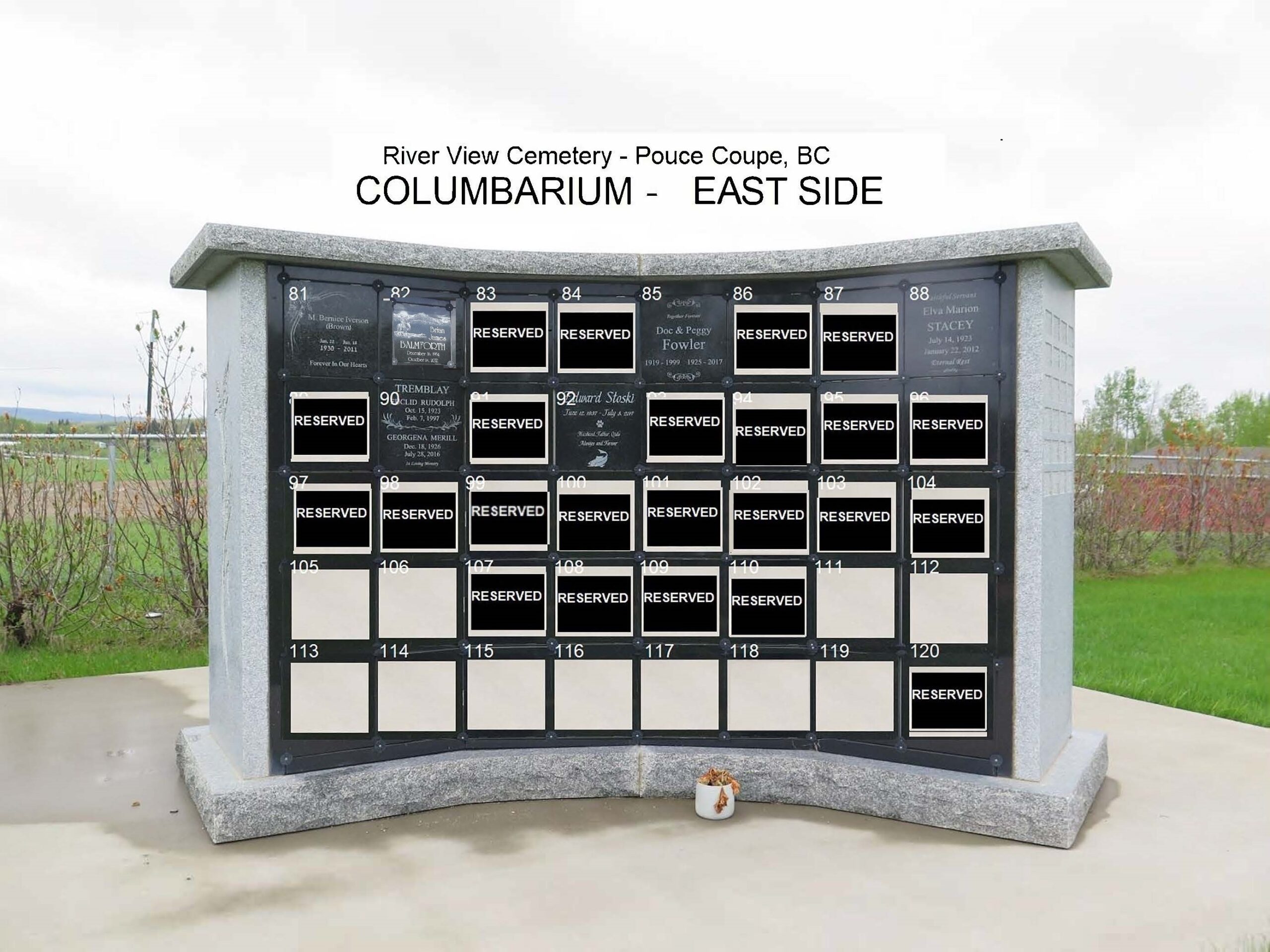 The Village of Pouce Coupe Riverview Cemetery is located minutes from Pouce Coupe at 404 Briar Ridge Road. Current interment options include traditional burials for both human and cremated remains, as well as columbarium niche inurnments for cremated remains.